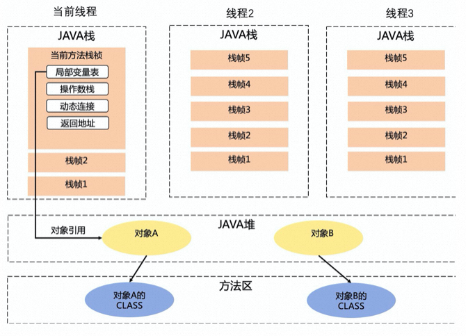 栈属于线程私有的数据区域,与线程同时创建,总数与线程关联,代表Java方法执行的内存模型。每个方法执行时都会创建一个栈帧来存储方法的的局部变量表、操作数栈、动态链接方法、方法返回值、返回地址等信息。每个方法从调用值结束就对于一个栈桢在虚拟机栈中的入栈和出栈过程,栈帧中的局部变量表可以存放基本类型,也可以存放指向对象的引用,当在某个方法中new Object()时,会在当前方法栈帧中的局部变量表存放一个指向堆内存实例对象的引用,详见下图。