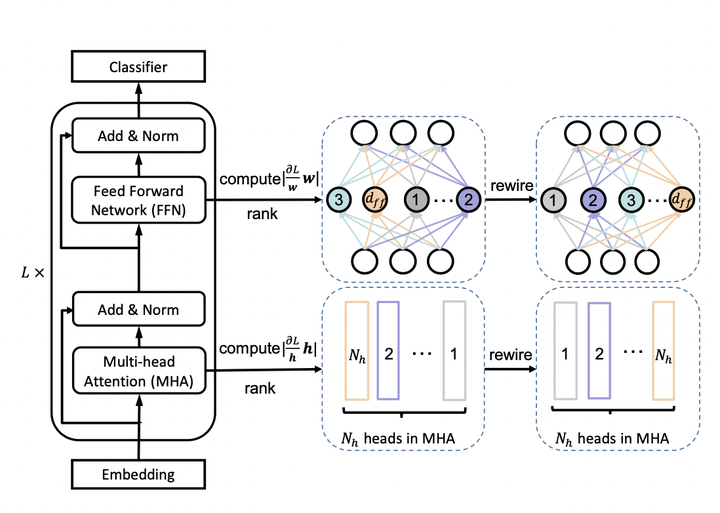 为了充分利用网络的容量,更重要的头部或神经元应该在更多的子网络中共享。因此,在训练宽度自适应网络前,作者在 fine-tuned BERT网络中根据注意力头和神经元的重要性对它们进行了排序,然后在宽度方向上以降序进行排列。这种选取机制被称为 Network Rewiring。