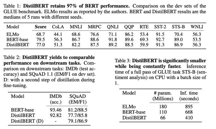 根据上图我们可以看到,DistilBERT与BERT相比减少了40%的参数,同时保留了BERT 97%的性能,但提高了60%的速度。