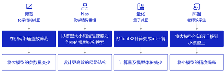 以上三点诉求都需要我们根据终端环境对现有模型进行小型化处理,在不损失精度的情况下,让模型的体积更小、速度更快,能耗更低。