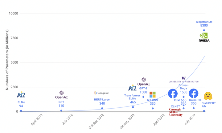 近年来,大规模预训练语言模型成为NLP任务的基本工具,虽然这些模型带来了显著的改进,但它们通常拥有数亿个参数(如图1所示),而这会引起两个问题。首先,大型预训练模型需要的计算成本很高。其次,预训练模型不断增长的计算和内存需求可能会阻碍语言处理应用的广泛落地。因此,作者提出DistilBERT,它表明小模型可以通过知识蒸馏从大模型中学习,并可以在许多下游任务中达到与大模型相似的性能,从而使其在推理时更轻、更快。
