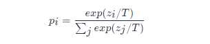 其中,TT控制输出分布的平滑度,当T变大时,类别之间的差距变小;当T变小时,类别间的差距变大。zizi代表分类ii的模型分数。在训练时对学生网络和教师网络使用同样的temperature TT,在推理时,设置T=1T=1,恢复为标准的softmax。