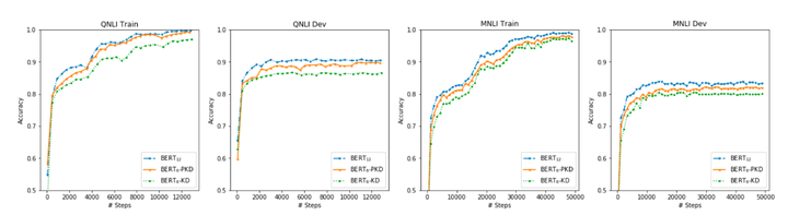 BERT预训练模型对资源的高需求导致其很难被应用在实际问题中,为缓解这个问题,论文中提出了Patient Knowledge Distillation(Patient KD)方法,将原始大模型压缩为同等有效的轻量级浅层网络。同时,作者对以往的知识蒸馏方法进行了调研,如图1所示,vanilla KD在QNLI和MNLI的训练集上可以很快的达到和teacher model相媲美的性能,但在测试集上则很快达到饱和。对此,作者提出一种假设,在知识蒸馏的过程中过拟合会导致泛化能力不良。为缓解这个问题,论文中提出一种“耐心”师生机制,即让Patient-KD中的学生模型从教师网络的多个中间层进行知识提取,而不是只从教师网络的最后一层输出中学习。