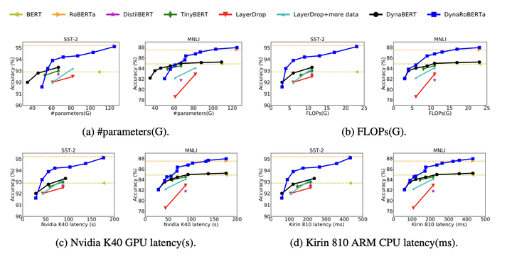 图4:Comparison of #parameters, FLOPs, latency on GPU and CPU between DynaBERT and DynaRoBERTa and other methods.
