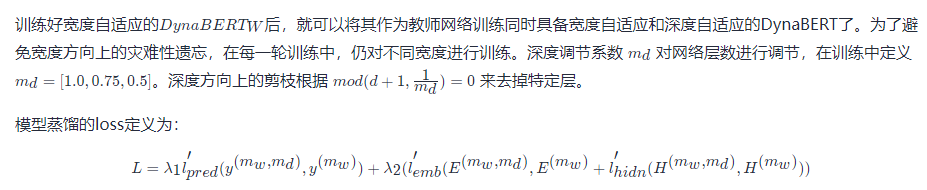 首先,将BERT网络作为固定的教师网络,并初始化 DynaBERTWDynaBERTW。然后通过知识蒸馏将知识从教师网络迁移到 DynaBERTWDynaBERTW 中不同宽度的学生子网络。其中,mw=[1.0,0.75,0.5,0.25]mw=[1.0,0.75,0.5,0.25]。