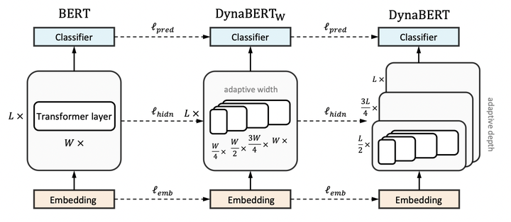 DynaBERT的训练阶段包括两部分,首先通过知识蒸馏的方法将teacher BERT的知识迁移到有自适应宽度的子网络student DynaBERTWDynaBERTW中,然后再对 DynaBERTWDynaBERTW 进行知识蒸馏得到同时支持深度自适应和宽度自适应的子网络 DynaBERT。训练过程流程图如图1所示。