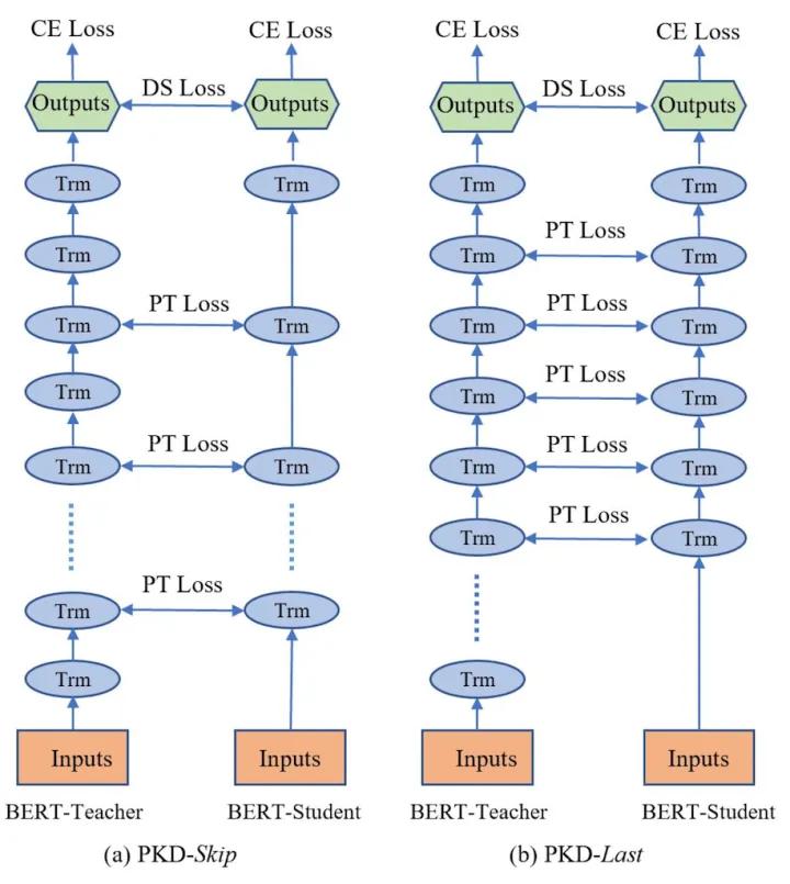 图2a: PKD-Skip 学生网络学习教师网络每两层的输出 图2b: PKD-Last 学生网络从教师网络的最后六层学习