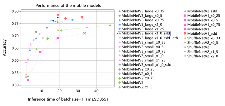 上图是分类模型使用了蒸馏和量化的效果图,横轴是推理耗时,纵轴是模型准确率。 图中最上边红色的星星对应的是在MobileNetV3_large model基础上,使用蒸馏后的效果,相比它正下方的蓝色星星,精度有明显的提升。 图中所标浅蓝色的星星,对应的是在MobileNetV3_large model基础上,使用了蒸馏和量化的结果,相比原始模型,精度和推理速度都有明显的提升。 可以看出,在人工设计的经典小模型基础上,经过蒸馏和量化可以进一步提升模型的精度和推理速度。