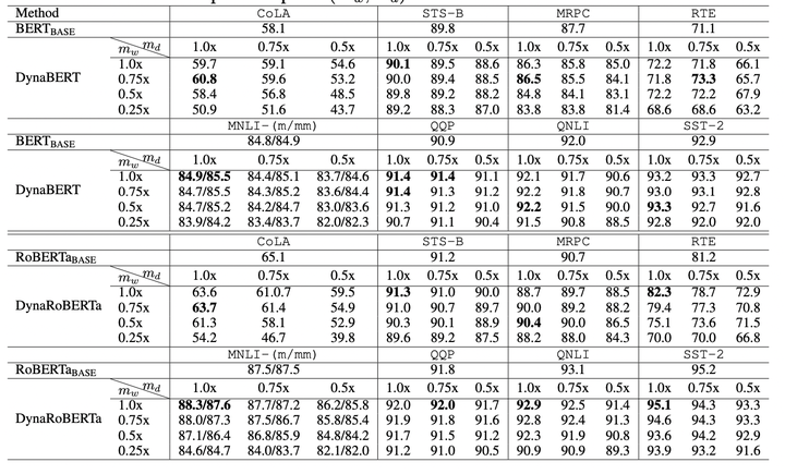 根据不同的宽度和深度剪裁系数,作者最终得到12个大小不同的DyneBERT模型,其在GLUE上的效果如下: