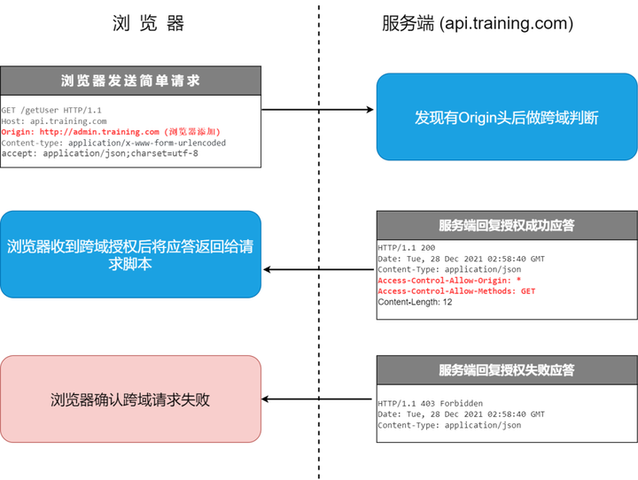简单请求模式,浏览器直接发送跨域请求,并在请求头中携带Origin的头,表明这是一个跨域的请求。服务器端接到请求后,会根据自己的跨域规则,通过Access-Control-Allow-Origin和Access-Control-Allow-Methods响应头,来返回验证结果。