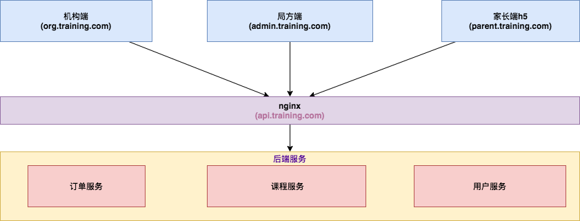 接入层调用的接口域名统一使用 api.training.com这个独立的域名,通过Nginx来配置请求转发。