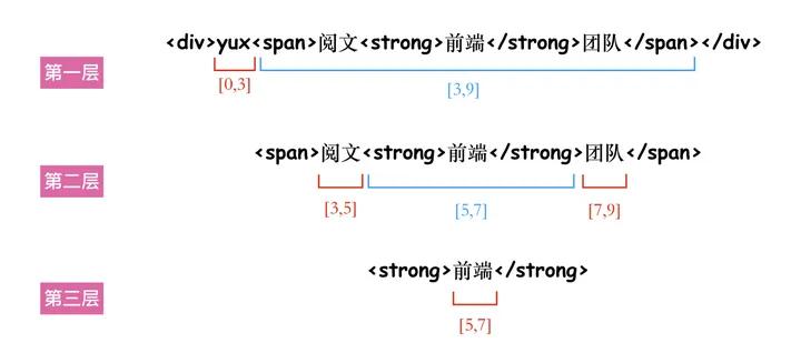 <div>yux<span>阅文<strong>前端</strong>团队</span></div>试着找了很多官方文档,可惜并没有直接获取的 API,只能逐层遍历了。整体思路就是,先通过childNodes获取第一层的信息,被分成好几个区间,如果需要的偏移量在这个区间,就继续往里遍历,直到最底层,示意如下: