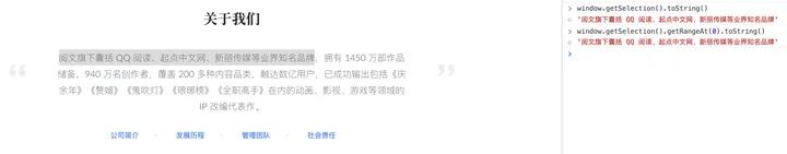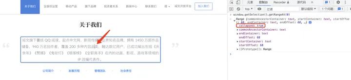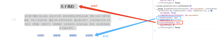 由于“阅文”是一个独立的标签,可以用到另外两个新的 API,range.selectNode 和 range.selectNodeContents,这两个都是表示选中某一节点,不同的是,selectNodeContents仅包含只节点,不包含自身