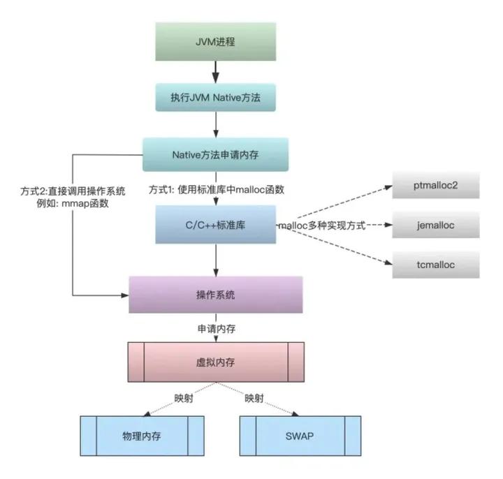 linux进程启动时,有代码段、数据段、堆(Heap)、栈(Stack)及内存映射段,在运行过程中,应用程序调用malloc、mmap等C库函数来使用内存,C库函数内部则会视情况通过brk系统调用扩展堆或使用mmap系统调用创建新的内存映射段。所以排查的逻辑:
