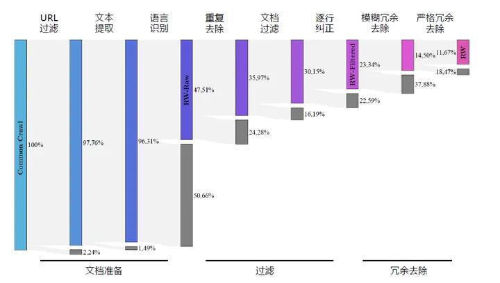 图3.2 RefinedWeb 中CommonCrawl 数据集过滤流程和数据过滤百分比