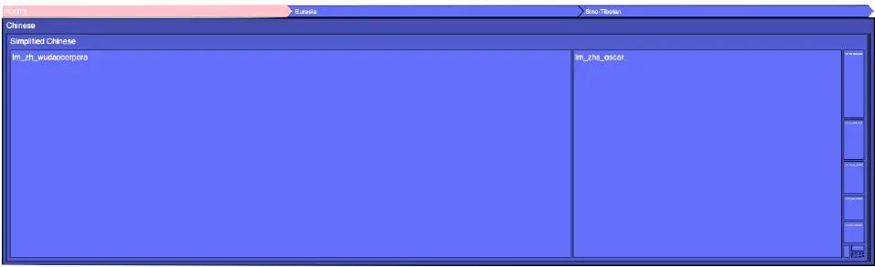 但是提供了Corpus Map 以及Corpus Description 工具,可以方便地查询各类数据集占比和数据情况。如图2.2所示,ROOTS 数据集中中文数据主要由WuDao Corpora 和OSCAR 组成。在虚拟抓取方面,由于很多语言的现有公开数据集合较少,因此这些语言的网页信息是十分重要的资源补充。在ROOTS 数据集中,采用CommonCrawl 网页镜像,选取了614 个域名,从这些域名下的网页中提取文本内容补充到数据集中,以提升语言的多样性。在GitHub 代码方面,针对程序语言,ROOTS 数据集采用了与AlphaCode相同的方法从BigQuery 公开数据集中选取文件长度在100 到20 万字符之间,字母符号占比在15%至65%,最大行数在20 至1000 行之间代码。大语言模型训练中,网页数据对于数据的多样性和数据量支撑都起到了重要的作用,ROOTS 数据集合中包含了从OSCAR 21.09 版本,对应的是Common Crawl 2021 年2 月的快照,占整体ROOTS 数据集规模的38%