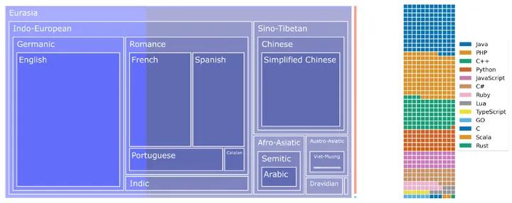 Responsible Open-science Open-collaboration Text Sources(ROOTS)数据集合 是BigScience项目在训练具有1760 亿参数的BLOOM 大语言模型所使用的数据集合。该数据集合包含46 种自然语言和13 种编程语言,总计59 种语言,整个数据集的大小约1.6TB。ROOTS 数据集合中各语言所占比例如图2.1所示。图中左侧是以语言家族的字节数为单位表示的自然语言占比树状图。其中欧亚大陆语言占据了绝大部分(1321.89 GB)。橙色矩形对应是的印度尼西亚语(18GB),是巴布尼西亚大区唯一的代表。而绿色矩形对应于0.4GB 的非洲语言。图中右侧是以文件数量为单位的编程语言分布的华夫饼图(Waffle Plot),一个正方形大约对应3 万个文件。