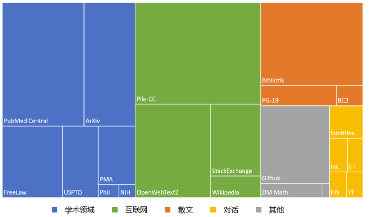 Pile 数据集[68] 是一个用于大语言模型训练的多样性大规模文本语料库,由22 个不同的高质量子集构成,包括现有的和新构建的,许多来自学术或专业来源。这些子集包括Common Crawl、Wikipedia、OpenWebText、ArXiv、PubMed 等。Pile 的特点是包含了大量多样化的文本,涵盖了不同领域和主题,从而提高了训练数据集的多样性和丰富性。Pile 数据集总计规模大小有825GB 英文文本,其数据类型组成如图1所示,所占面积大小表示数据在整个数据集中所占的规模。