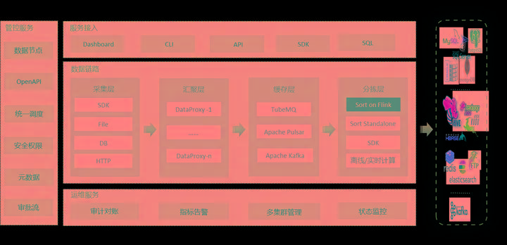 作为业界首个一站式、全场景海量数据集成框架,Apache InLong(应龙) 提供了自动、安全、可靠和高性能的数据传输能力,方便业务快速构建基于流式的数据分析、建模和应用。目前 InLong 正广泛应用于广告、支付、社交、游戏、人工智能等各个行业领域,服务上千个业务,其中高性能场景数据规模超百万亿条/天,高可靠场景数据规模超十万亿条/天。InLong 项目定位的核心关键词是“一站式”、“全场景”和“海量数据”。对于“一站式”,我们希望屏蔽技术细节、提供完整数据集成及配套服务,实现开箱即用;对于“全场景”,我们希望提供全方位的解决方案,覆盖大数据领域常见的数据集成场景;对于“海量数据”,我们希望通过架构上的数据链路分层、全组件可扩展、自带多集群管理等优势,在百万亿条/天的基础上,稳定支持更大规模的数据量。
