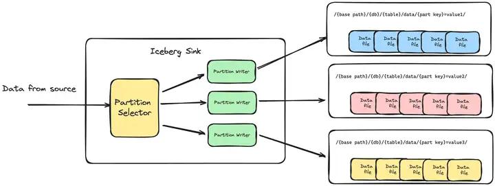 与 Hive 类似,Iceberg 通过文件目录来管理不同分区的数据,所有的数据按照分区写入在对应目录的数据文件中。同时,Iceberg 还支持多级分区,目录按照 /k1=v1/k2=v2/…/kn=vn/ 的方式进行组织。下图为 InLong Sort 将数据写入不同分区的实现细节,根据 Iceberg 的特性,Sort 为不同分区的数据分别初始化了各自的 Writer,通过 Partition Selector 将数据路由至对应的 Writer 上,每个 Writer 在同一时间内只会打开目录下的一个 Data file。在文件写入满足最大文件大小,或者进行 checkpoint 时,当前文件会被关闭并记录。