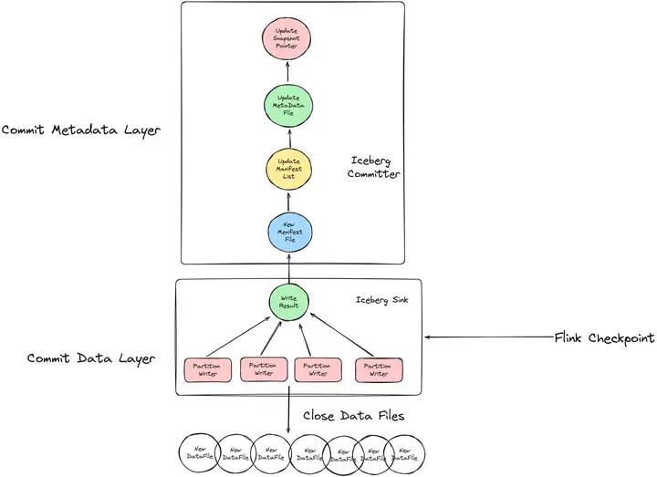 InLong Sort 通过在 Flink Checkpoint 时提交 Iceberg Snapshot 的方式来实现事物更新快照的能力,流程上与 Iceberg 表查询流程正好相反。如下图所示,当检测到 Flink Chekcpoint 通知时,Iceberg Sink 会关闭并统计当前所有的写入文件,将文件名,路径,数据条数等信息提交给 Iceberg Committer 算子。Committer 算子会进一步聚合当前 Checkpoint 周期的写入结果,并形成一个新的 Manifest File,接着更新生成新的 Manifest List,并产生一个全新的 Snapshot,将该 Snapshot 信息加入到 Metadata File中。最终 Iceberg Catalog 将当前的元数据指针指向最新的 Metadata Flie。