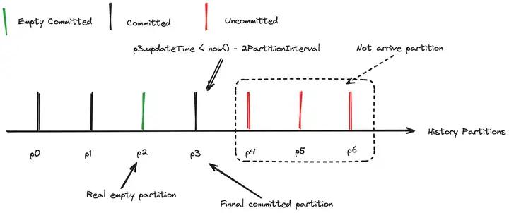 因此 Sort 通过判断最后提交的分区和当前时间的关系来推测数据是延迟到达还是确为空分区。例如下图所示,p3 为最后提交的分区,p3的提交时间和当前时间对比在2个分区周期之内,则认为 Sort 还在处理延迟到达的数据,p4, p5, p6 分区数据还未处理,不能进行超时提交。