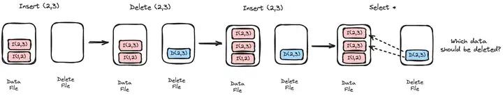在 v2 版本中,Iceberg 支持通过 Merge on Read(MOR)的模式更新数据。与传统 Copy on Write 的模式不同,MOR 不再将所有数据加载到内存中后逐项对比更新再写入文件,而是将 Update 的操作拆分成 Delete 和 Insert 两步,但这在同一行多次更新时会导致错误语义。下图为导致错误语义的事例,通过反复插入删除同一行数据,最终查询时 Iceberg 将无法推断最终应该展示哪一次插入的数据。
