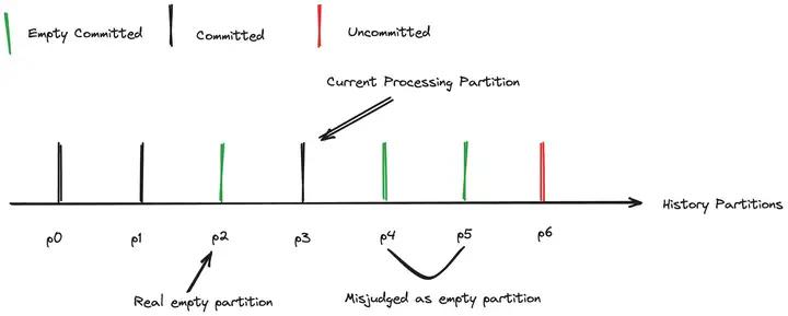 在某些场景下,业务数据并不是连续上报的,但业务也希望获得空分区的信息。因此,InLong Sort 增加了空分区检测的能力。一个简单的做法是如果当前分区数据超过一定时间还未提交,则默认该分区为空分区。但是这种检测机制存在一定的问题,如下图所示,如果数据处理存在大量延迟,当前处理的数据时间远落后于当前时间,那么就将导致数据未到达的分区被误判为空分区。