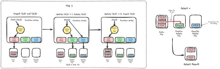 因此 Iceberg 通过 Mixed position-delete and equality-delete 的方式保证更新和删除操作的正确性。简单来说,Iceberg 将不同的操作写入了 Data File, Equality Delete File, Position Delete File 三类文件中。 Equality Delete File 负责记录同一行数据的删除记录,而 Position Delete File 则负责解决一个 Transaction 内同一行数据反复插入删除的语义问题。在查询时,对于 Position Delete File 只需要和当前 Transaction 对应的 Data File进行 Join 操作,Equality Delete File 和之前 Transaction 进行 Join 操作,最终便能保证流程的正确性。如下图所示,在 InLong Sort 实现里, 通过 Position Map 来维护当前 Transaction 中具体 Key 最新对应的文件名和位置,Insert 操作在写入 Data File 前先记录其写入的位置,Delete 操作通过查询 Position Map 当前 Transaction 是否记录了该数据的插入信息。如果是,将该信息写入 Position Delete File 和 Equality Delete File;反之则只写入 Equality Delete File。