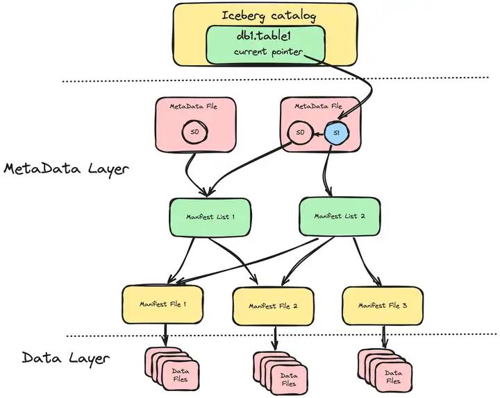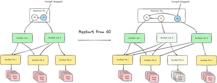 借助 Iceberg Snapshot 的特性,Sort 支持在故障恢复以及数据重做时的 Exactly Once 语义。具体的实现非常简单,InLong Sort 在每个 Checkpoint 后记录上一次完成的 Snapshot ID 号,在故障恢复(默认从上次成功的 Checkpoint 重启)以及用户指定时间重做数据(用户选择从指定 Checkpoint/Snapshot 重启)后,从上一次完成的 Snapshot 开始重置整个 Snapshot 的父子关系。以下图为例,当 InLong Sort 从 S0 对应的 Checkpoint 开始重启时,新的 Snapshot S2 将会从 S0 的基础上开始更新 Manifest 文件,S1 所对应的 Manifest 和 Data Files 将会被废弃。