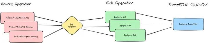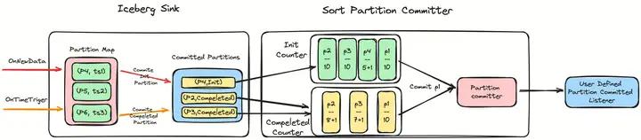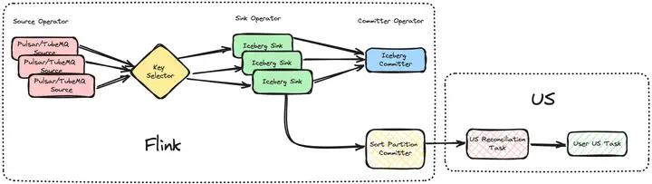 上图为 Sort on Flink 主要流程,入 Iceberg 任务由三个算子一个分区选择器组成,Source 算子从源端拉取数据, Key Selector 负责计算数据对应的分区,并将其映射到分区对应的 Sink 算子上,Iceberg Sink 算子则负责实际的数据写入,最终由 Committer 算子保存写入结果,将其置为用户可见的状态。