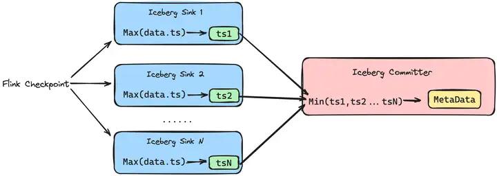 Sort on Flink 支持简单的 Watermark 推断能力,用户可以从 Metadata File 中获取当前 Snapshot 对应的 Watermark,也可以在 US 平台上配置 Watermark 检测任务,从而触发业务自定义的周期性任务。如下图所示,Iceberg Sink 中会记录整个 Snapshot 周期内获取的最大的数据时间 ts,在 Checkpoint 时在 Iceberg Committer 会汇总所有 Sink 的 Watermark,并选择其中的最小值,将其记录进 Metadata File 之中。