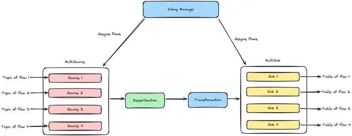 依托于 Apache InLong 全链路,Sort on Flink 拥有更加准确且丰富的对账能力。Sort on Flink 支持单任务多流向,每个流向通过各自的配置文件进行描述,如下图所示,在逻辑上数据流之间是互相隔离的,单个流向的上线和下线由 InLong Manager 控制,且不会影响到其他流向的正常运行。因此对于小流量业务而言,Sort on Flink 通过共享任务资源的方式,拥有更低的接入成本和运营成本。
