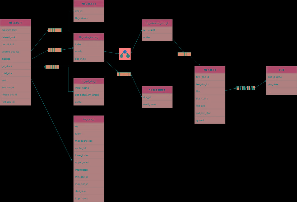 为了缓解该问题,Innodb引入了全文索引cache,其作用与Change Buffer类似。每次插入一个文档时,先将分词结果缓存到cache,等到cache满了再批量刷到磁盘,从而避免频繁地刷盘。Innodb定义了fts_cache_t的结构来管理cache,如下图所示: