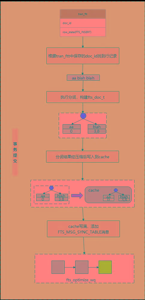 ->fts_optimize_create_msg(FTS_MSG_SYNC_TABLE)其中,fts_add_doc_by_id是比较关键的一个函数,该函数主要完成了以下几件事: