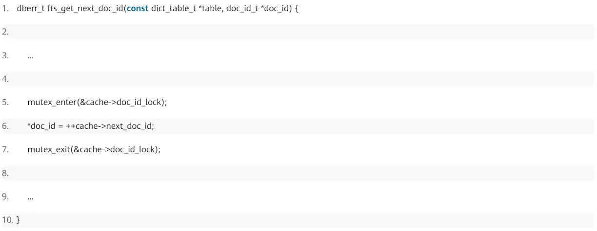 ->fts_trx_table_add_opfts_get_next_doc_id与fts_trx_table_add_op是比较重要的两个函数,fts_get_next_doc_id是为了获取doc_id,innodb行记录中包含了一些隐藏列,比如row_id、trx_id等,若创建了全文索引,其行记录中也会增加一个隐藏字段FTS_DOC_ID,这个值在fts_get_next_doc_id中获取的,如下: