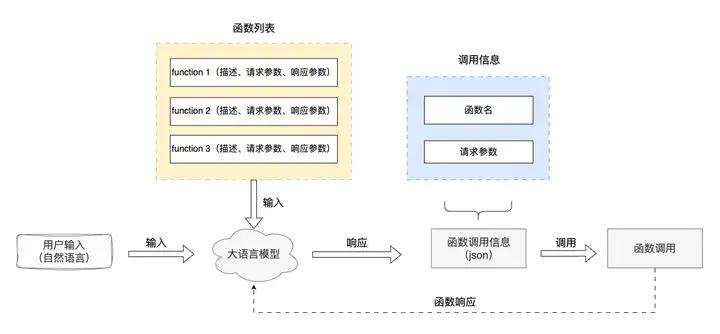 ]调用方获得 LLM 返回的函数调用信息(函数名称和调用参数)后,自行调用函数,并得到函数执行的响应。如果有需要,还可以把函数执行的响应追加到 chat API 的对话中传给 LLM,让 LLM 组织成自然语言回复用户。