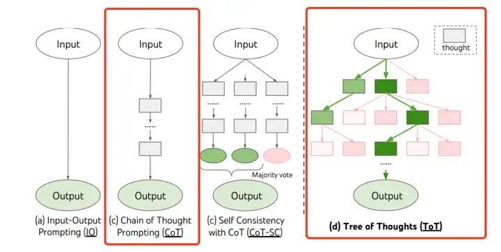 template="Answer the question: Q: {question}? Let's think step by step:"对 CoT 的进一步扩展,在思维链的每一步,推理出多个分支,拓扑展开成一棵思维树。使用启发式方法评估每个推理分支对问题解决的贡献。选择搜索算法,使用广度优先搜索(BFS)或深度优先搜索(DFS)等算法来探索思维树,并进行前瞻和回溯。