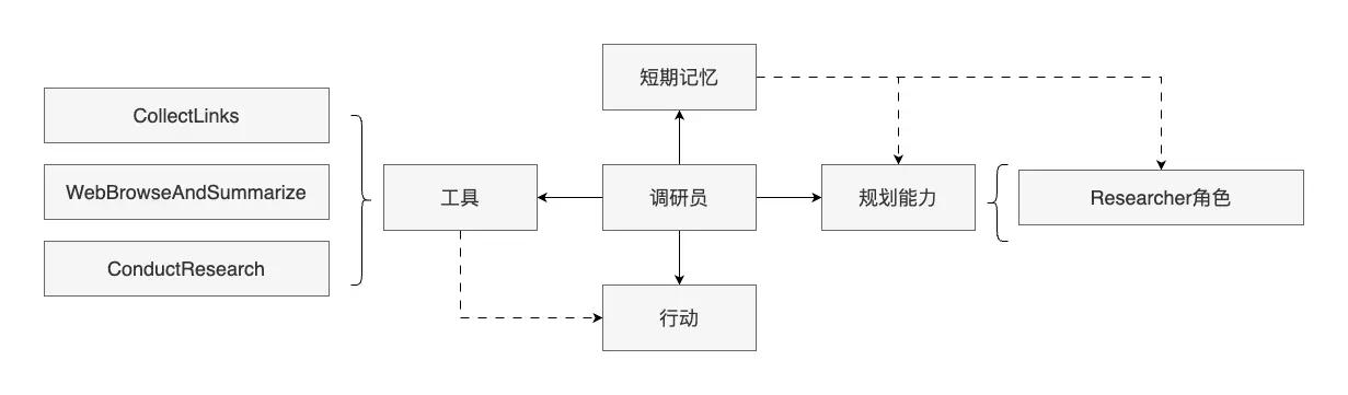 | 工具 | ConductResearch | 生成调研报告。基于 LLM 提示工程的工具,该工具会整合 WebBrowseAndSummarize 的输出给到 LLM,让 LLM 生成调研报告 |