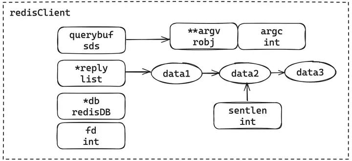 } redisClient;我们也用简单的示意图展示了redisClient的结构,它包含命令传输所使用的querybuf,命令在经过处理后会存放到argv中;然后比较重要的是*reply表示服务端给到客户端的回复的数据,这是个列表会在客户端写就绪的时候一个一个写回客户端,sentlen则是标识了传输的长度;然后就是对应的db与socket句柄fd。