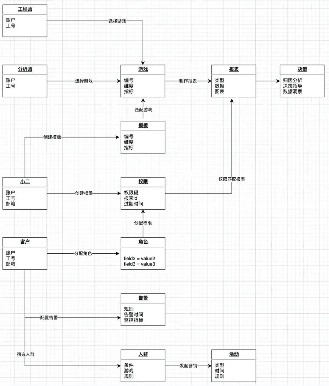 实体:报表,报表模板,权限,角色,人群,活动,决策