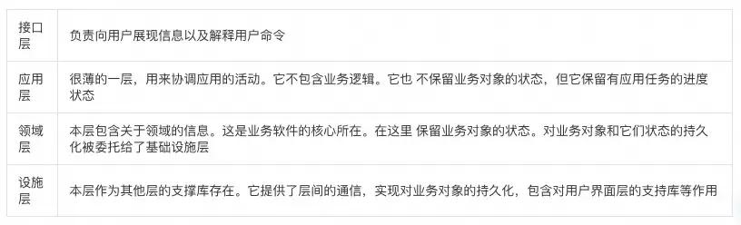 将应用按层分离并且建立好约束的交互规则是很有必要的,代码如果没有被放在正确的位置上,则很快会发生混乱。领域层最核心的职责只应该关心领域方面的业务问题。基础设施则只需关心底层的数据交互和外界的数据通讯交换,而无需关注业务的实现。代码层面上各层的实现职责如下: