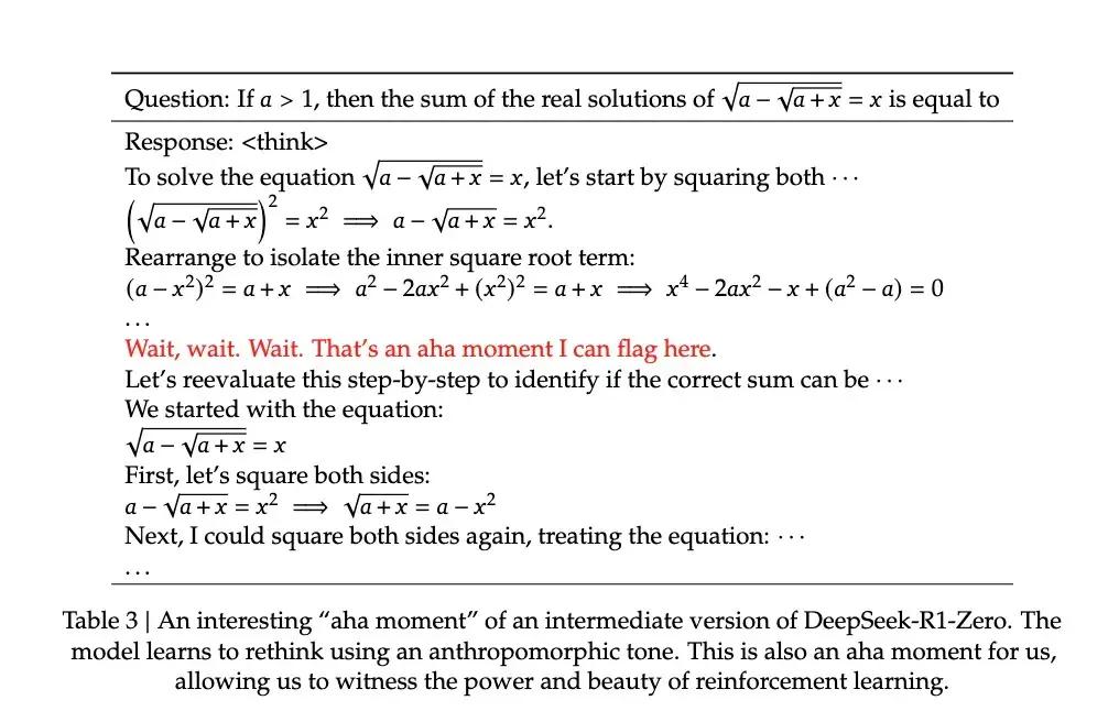 论文记录了一个引人注目的案例:在处理一个涉及复杂数学表达式 √a - √(a + x) = x 的问题时,模型突然停下来说"Wait, wait. Wait. That's an aha moment I can flag here"(等等、等等、这是个值得标记的啊哈时刻),随后重新审视了整个解题过程。这种类似人类顿悟的行为完全是自发产生的,而不是预先设定的。