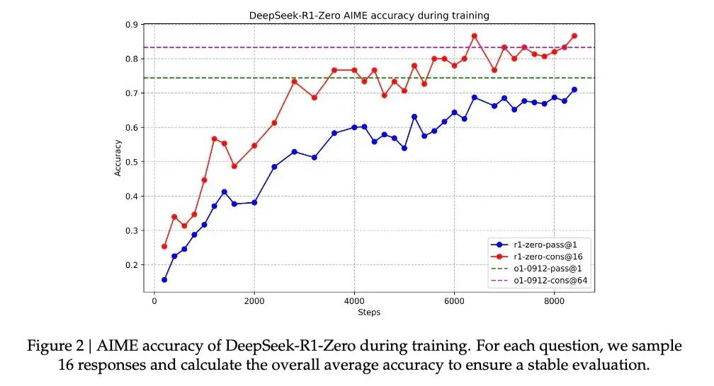 然而,DeepSeek-R1 Zero的潜力似乎更大。它在AIME 2024测试中使用多数投票机制时达到的86.7%准确率——这个成绩甚至超过了OpenAI的o1-0912。这种"多次尝试会变得更准确"的特征,暗示R1-Zero可能掌握了某种基础的推理框架,而不是简单地记忆解题模式。