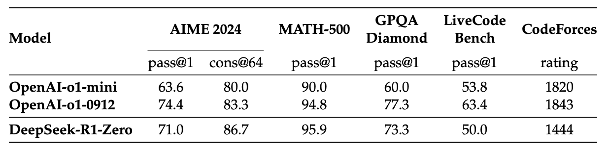 表8. DeepSeek-R1-Zero 与 OpenAI o1 模型在推理类开源基准测试中的效果对比