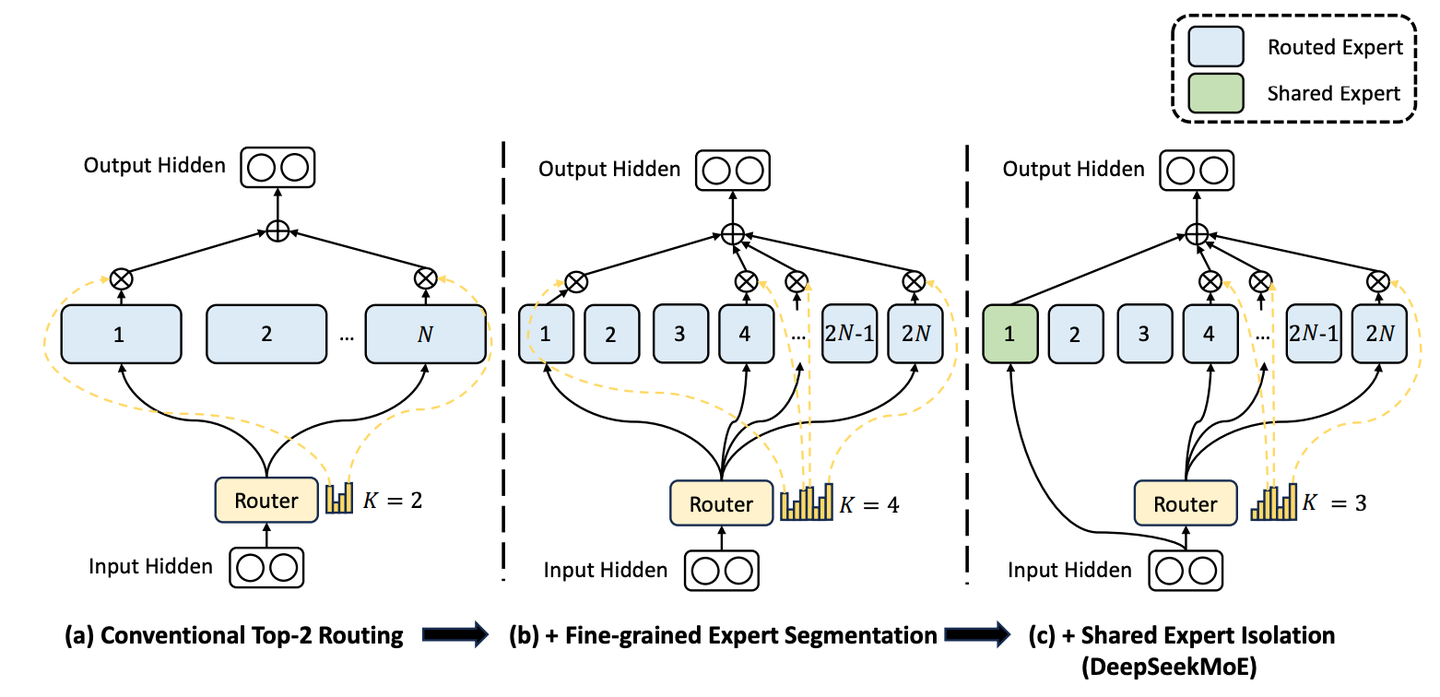 图1选自DeepSeek-Moe报告[1],展示了 DeepSeek 从传统 MoE 模型架构(a)的基础上,做的两部分改进(b)与(c):