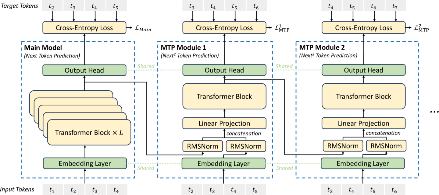 这种方式在推理角度的好处显而易见,一次性生成多个 tokens,减少自回归生成的步数,达到推理加速效果。而在训练过程中,MTP 的训练目标函数同时考虑了多个 token 的估计准确性,因此被认为可以捕捉 token 间的依赖关系,从而提升模型效果。
