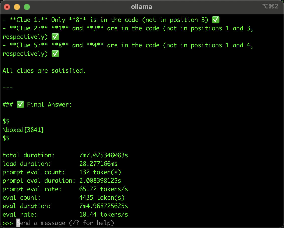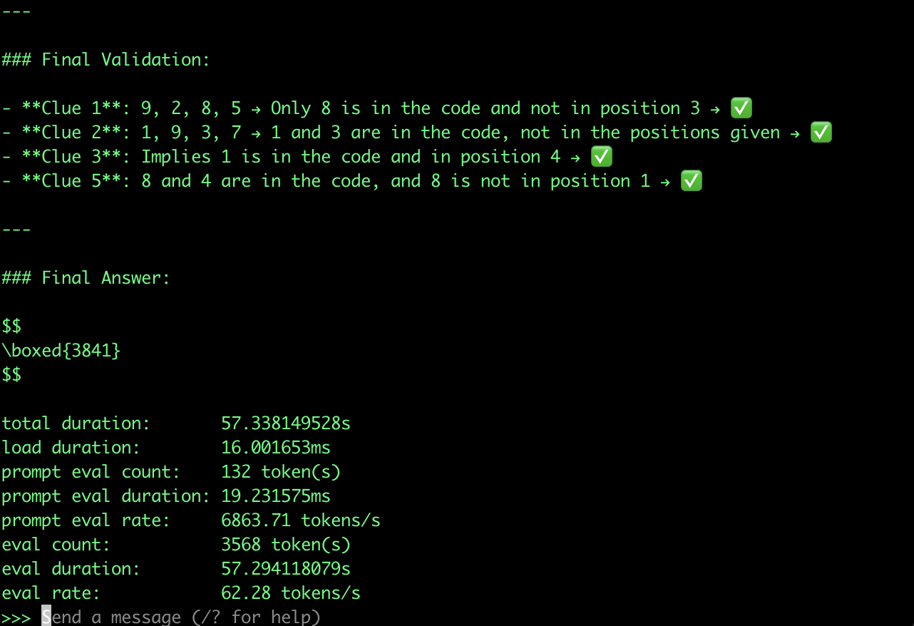 结果还挺让我惊喜,它竟然答对了。这只是14B版本的啊,而且还是Q4_K_M量化过的,性能肯定不如FP16量化的,但它依然表现出了强大的推理能力。虽然受限于我电脑性能(没有GPU),它共用了4000多个token,跑了7分钟,每秒输出速度为10.44token,但是,它答对题目了啊!