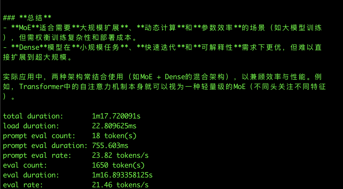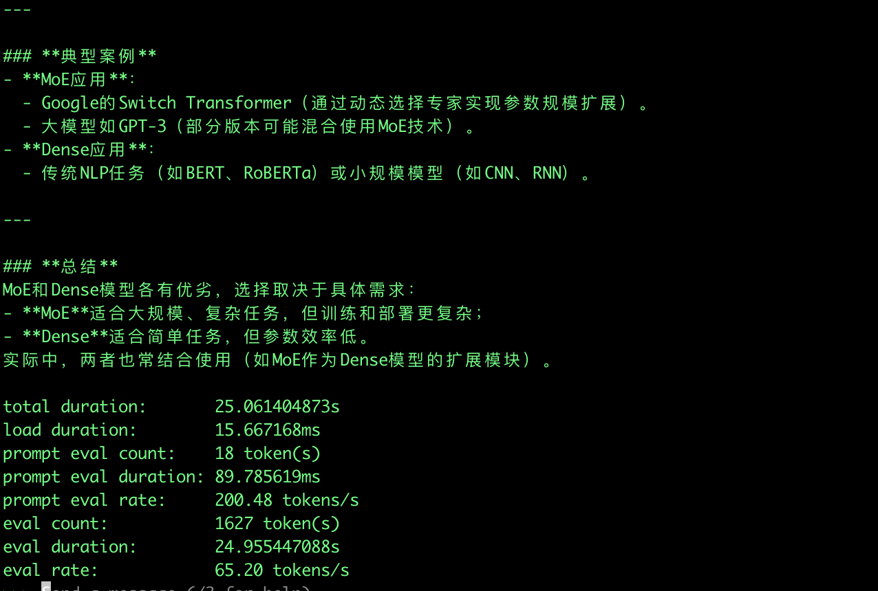 我们再来测试个MoE版本的吧。再压榨下我MacBook的极限,用的是Qwen3-30B-A3B 在Ollama 上的Q4_K_M量化版本。这次换一个中文的问题吧。