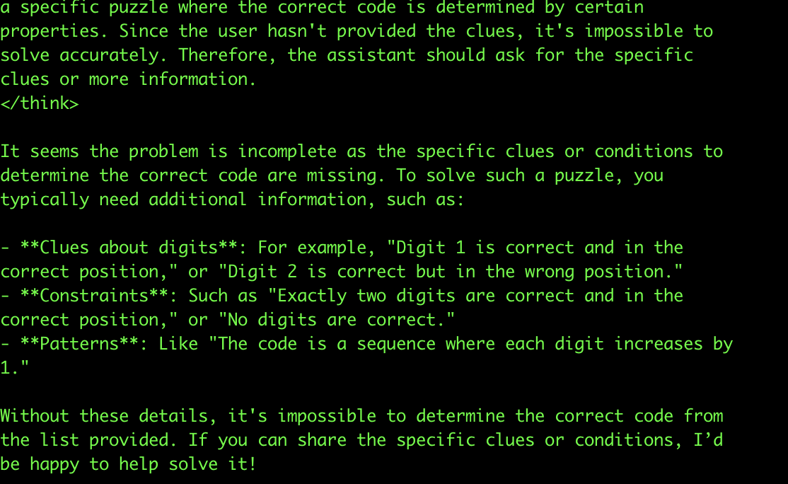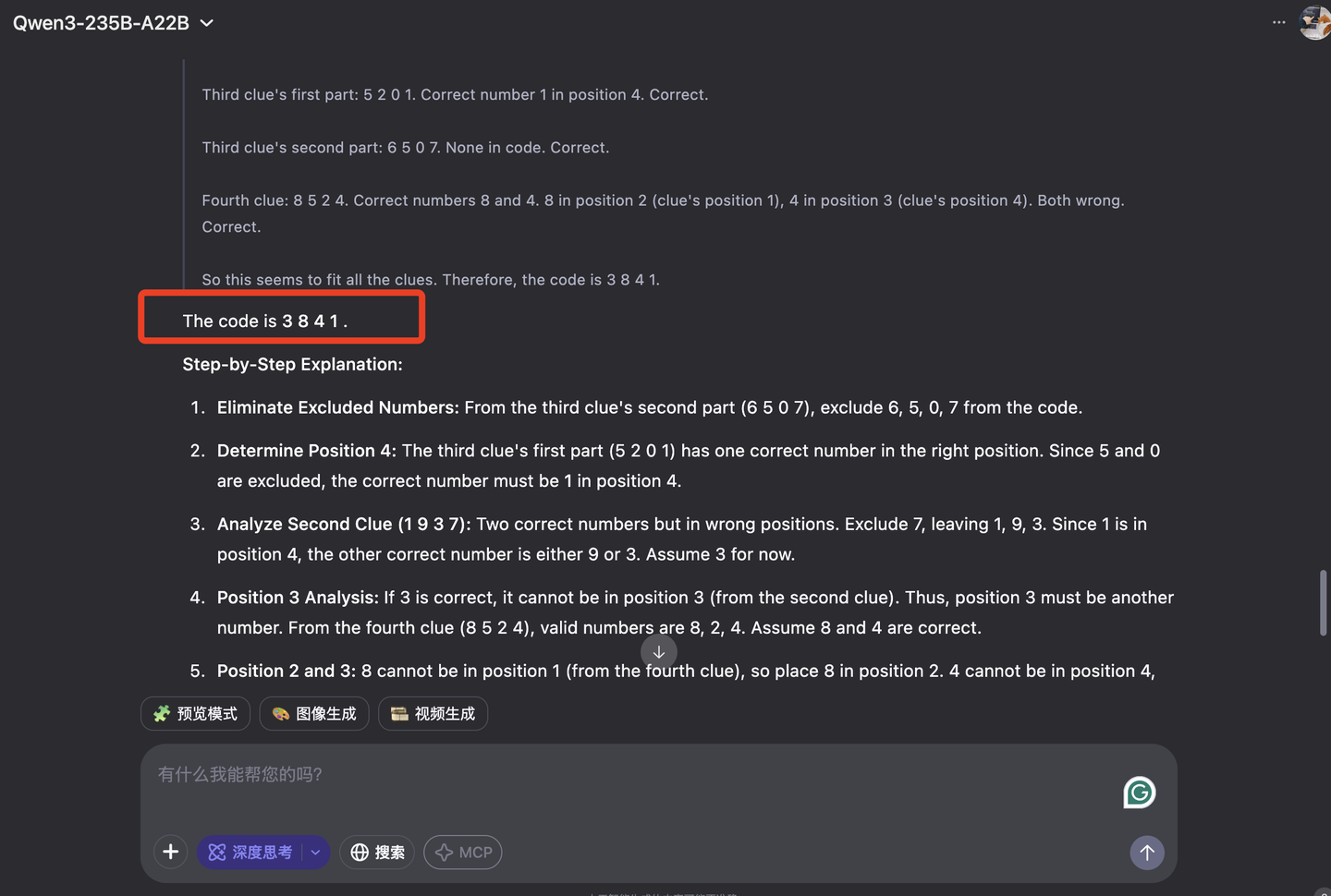 也许读者会好奇,它维持推理能力的尺寸极限在哪?我继续试了更小的模型,Qwen3 8b-fp8的版本,结果它推理不出来。